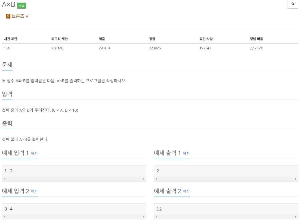 두 정수 A와 B를 입력받은 다음, A×B를 출력하는 프로그램을 작성하시오.