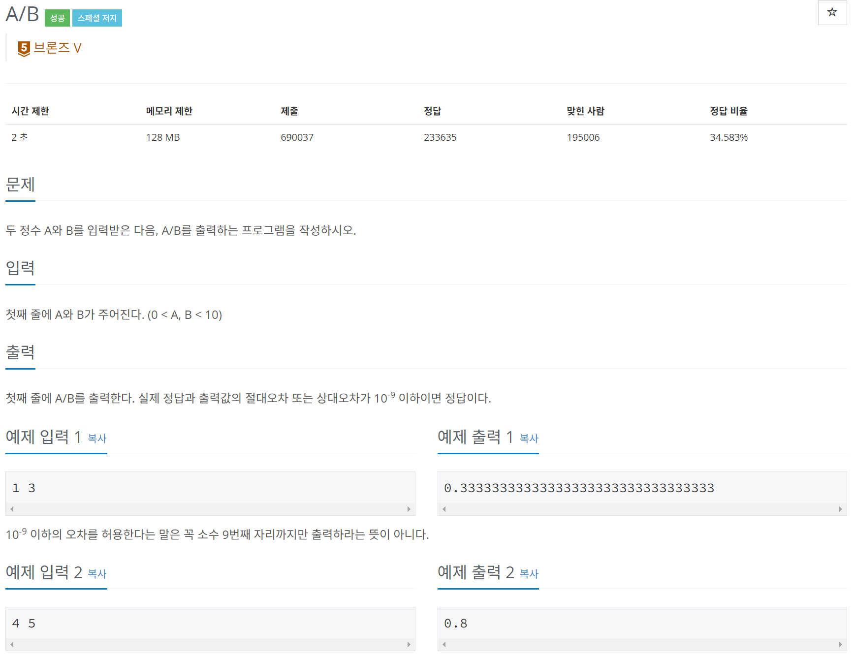 두 정수 A와 B를 입력받은 다음, A/B를 출력하는 프로그램을 작성하시오.