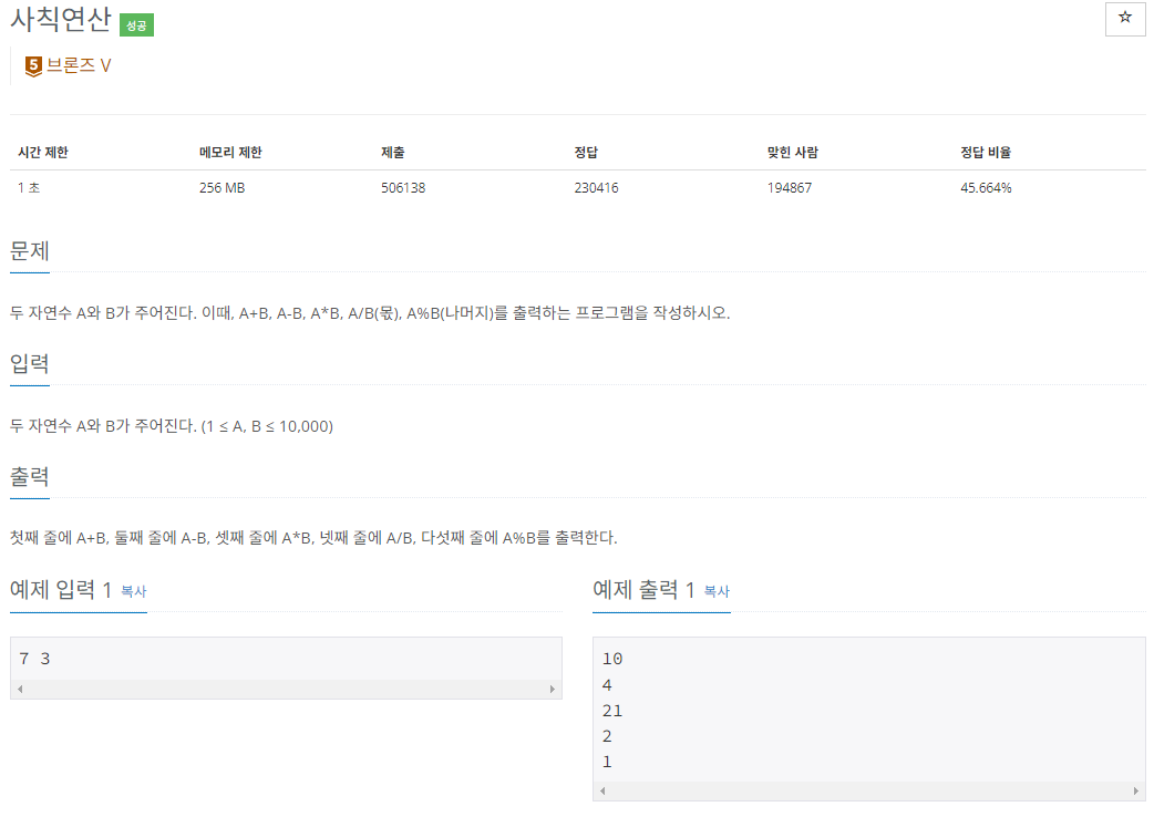 두 자연수 A와 B가 주어진다. 이때, A+B, A-B, A*B, A/B(몫), A%B(나머지)를 출력하는 프로그램을 작성하시오.