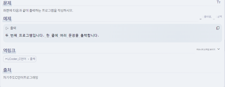 - "두 번째 프로그램입니다. 한 줄에 여러 문장을 출력합니다."를 출력한다.