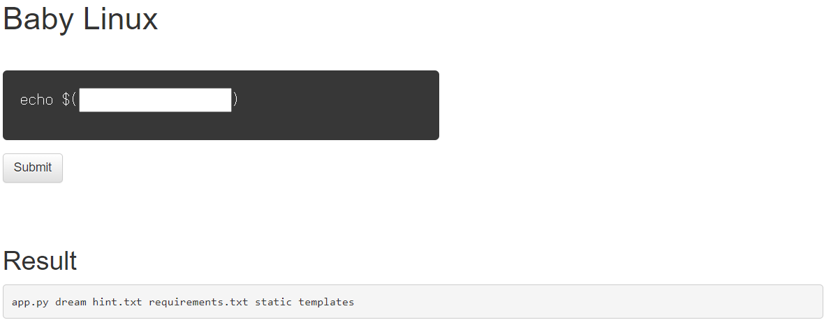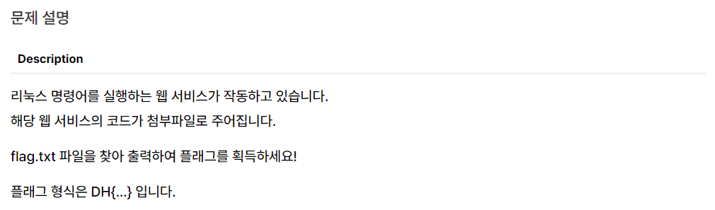 Description 리눅스 명령어를 실행하는 웹 서비스가 작동하고 있습니다. 해당 웹 서비스의 코드가 첨부파일로 주어집니다. flag.txt 파일을 찾아 출력하여 플래그를 획득하세요! 플래그 형식은 DH{...}
