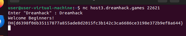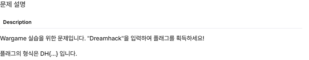 Description Wargame 실습을 위한 문제입니다. "Dreamhack"을 입력하여 플래그를 획득하세요! 플래그의 형식은 DH{...} 입니다.