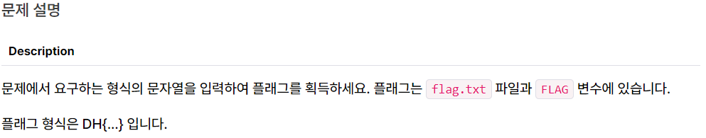 Description 문제에서 요구하는 형식의 문자열을 입력하여 플래그를 획득하세요. 플래그는 flag.txt 파일과 FLAG 변수에 있습니다. 플래그 형식은 DH{...} 입니다.
