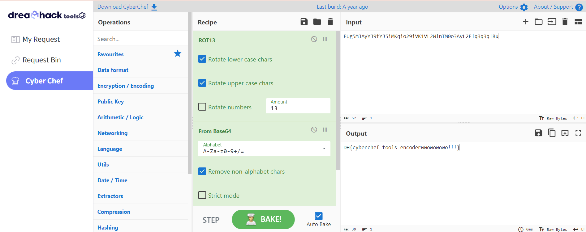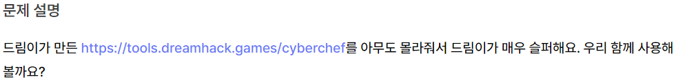 드림이가 만든 https://tools.dreamhack.games/cyberchef를 아무도 몰라줘서 드림이가 매우 슬퍼해요. 우리 함께 사용해볼까요?