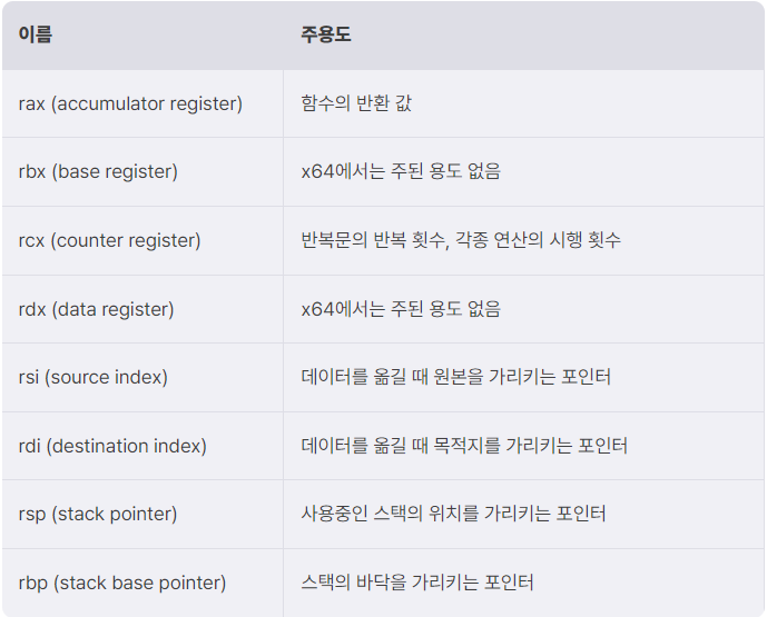 (x86-64에서도 그대로 사용 가능하다.) - rax, rbx,rex, rdx, rsi, rdi, rsp, rbp가 이들의 확장된 형태이다.
