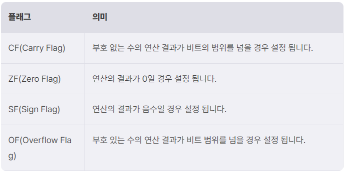 - 프래그 레지스터(Flag Register): CPU의 상태를 저장하는 레지스터