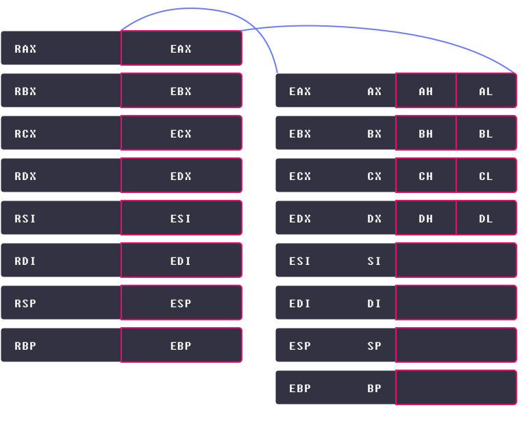eax, ebx 등은 확장된 레지스터의 하위 32비트를 가리킨다. - 마찬가지로 과거 16비트 아키택처인 IA-16과 호환을 위해 ax, bx,cx,dx,si,di,sp,bp는 eax, ebx , ecx , edx, esi, edi, esp, ebp의 하위 16비트를 가리킨다.