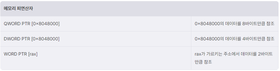 - 메모리 피연산자는 []으로 둘러싸이게 표현한다, 앞에 크기 지정자(Size Directive) TYPE PTR이 추가될 수 있다.