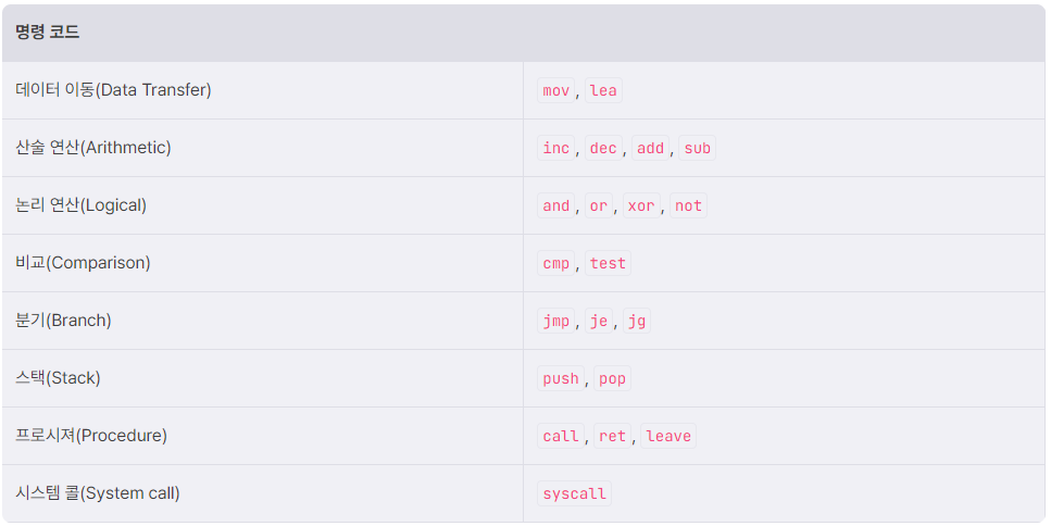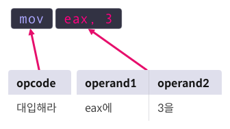 - 동사에 해당하는 명령어(Operation Code, Opcode) 와 목적어에 해당하는 피연산자(Operand)로 구성된다.