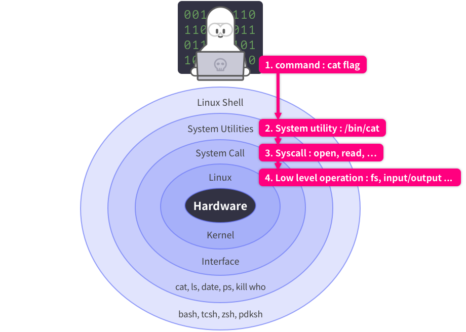 - 예를들어, 삳용자가 'cat flag'를 실행하면, cat은 flag라는 파일을 읽어서 사용자의 화면에 출력해줘야 한다.