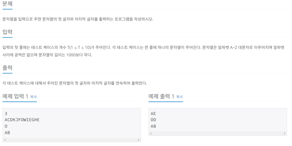 한번 입력 받을 때마다 문자열의 처음와 끝을 출력한다.