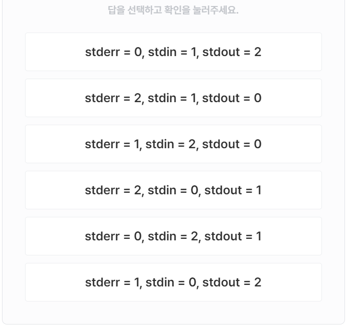 - stderr(표준 오류): 에러 메시지나 기타 진단 메시지를 출력하기 위한 파일 지정자이다. 그값은 2다.