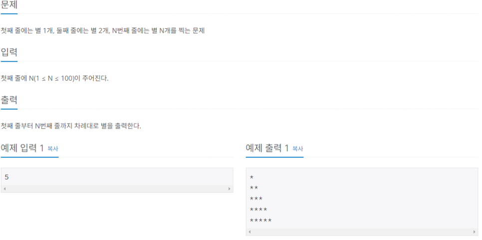 첫째 줄에는 별 1개, 둘째 줄에는 별 2개, N번째 줄에는 별 N개를 찍는 문제