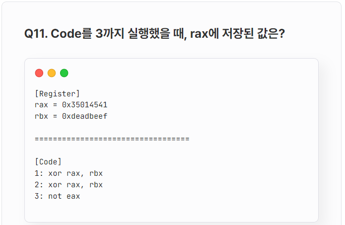 | [Dream hack] Quiz: x86 Assembly 1-8 (0) | 2024.05.18 |