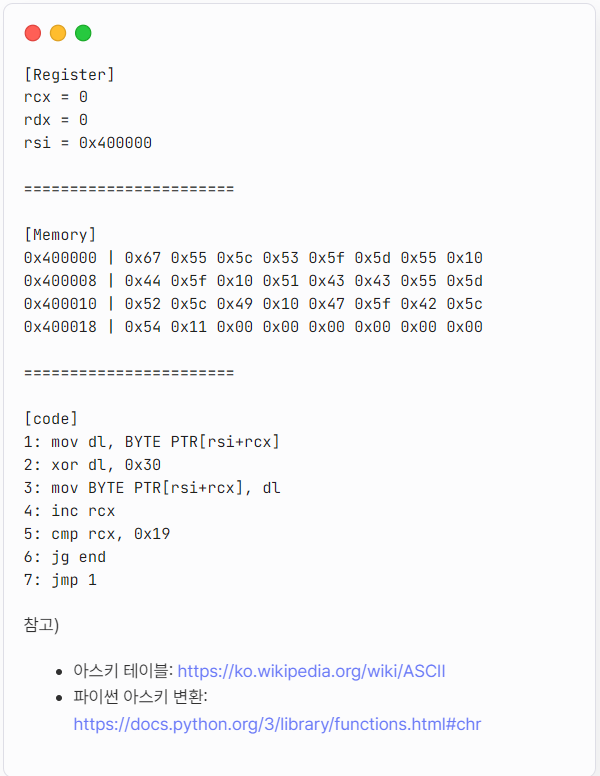 - 'dl'에 0x30을 xor 연산 한다. 0x67 ^ 0x30 = 0x57 (ASCII 'W')