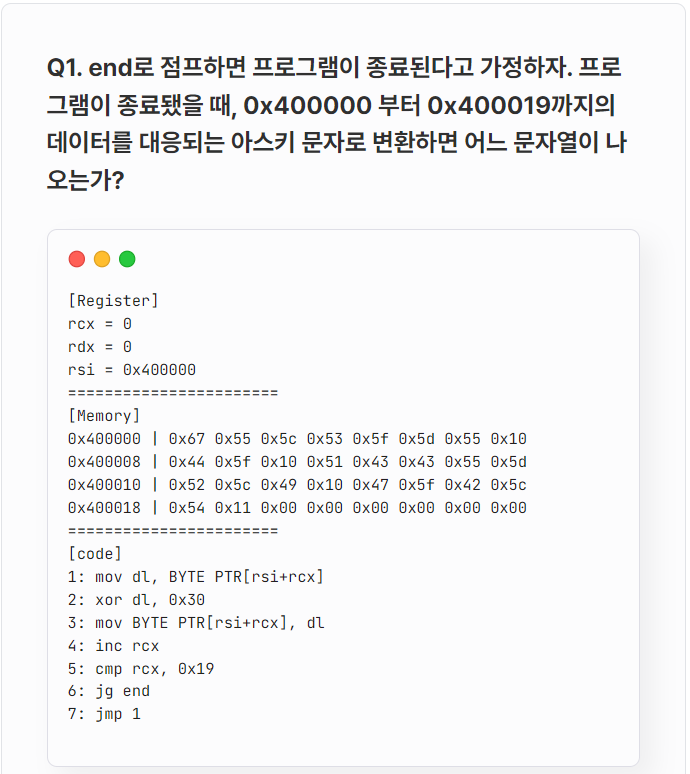 답더보기초기상태레지스터:rcx = 0rdx = 0rsi = 0x400000메모리0x400000: 0x67 0x55 0x5c 0x53 0x5f 0x5d 0x55 0x100x400008: 0x44 0x5f 0x10 0x51 0x43 0x43 0x55 0x5d0x400010: 0x52 0x5c 0x49 0x10 0x47 0x5f 0x42 0x5c0x400018: 0x54 0x11 0x00 0x00 0x00