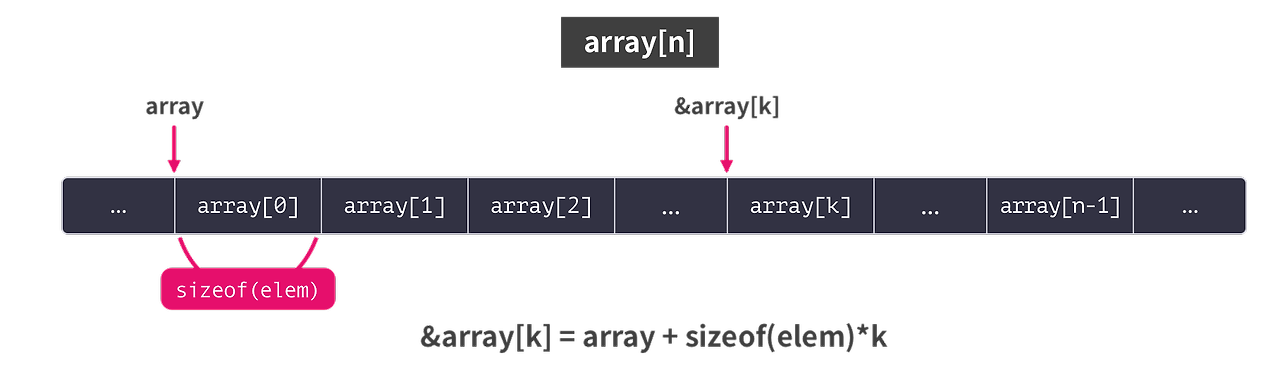 배열의 각 요소의 주소는 배열의 주소, 요소의 인덱스, 요소 자료형의 크기를 이용하여 계싼할 수 있다!