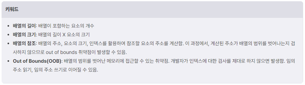 대표적으론 Out of Bounds (OOB) : 배열의 인덱스에 접근 가능