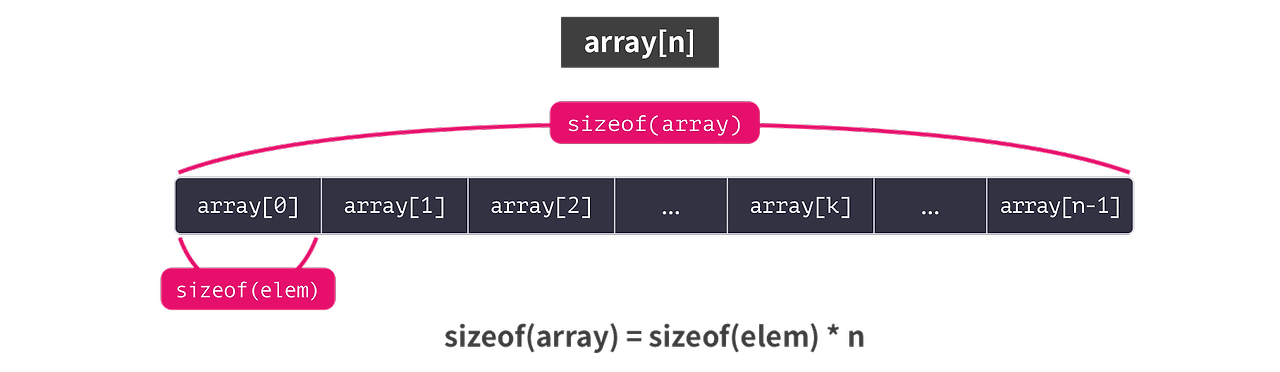 배열은 연속된 공간을 가지며, 그 크기는 요소의 개수와, 자료형의 크기를 곱한 값이다.