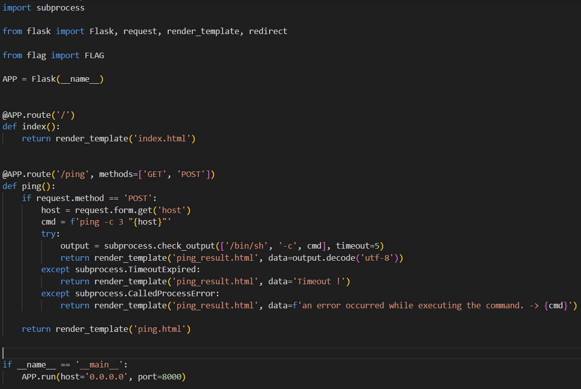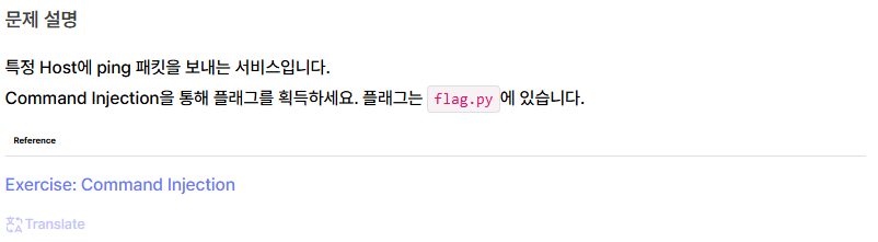 특정 Host에 ping 패킷을 보내는 서비스입니다. Command Injection을 통해 플래그를 획득하세요. 플래그는 flag.py에 있습니다. Reference Exercise: Command Injection