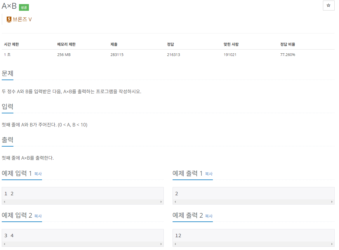 두 정수 A와 B를 입력받은 다음, A×B를 출력하는 프로그램을 작성하시오.
