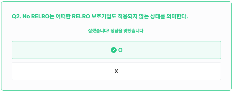 3. Full RELRO : GOT 영역을 읽기 전용으로 설정해 공격자가 이를 수정하지 못하도록 한다.
