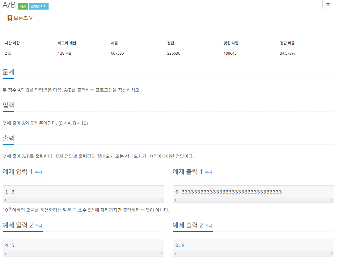 두 정수 A와 B를 입력받은 다음, A/B를 출력하는 프로그램을 작성하시오.
