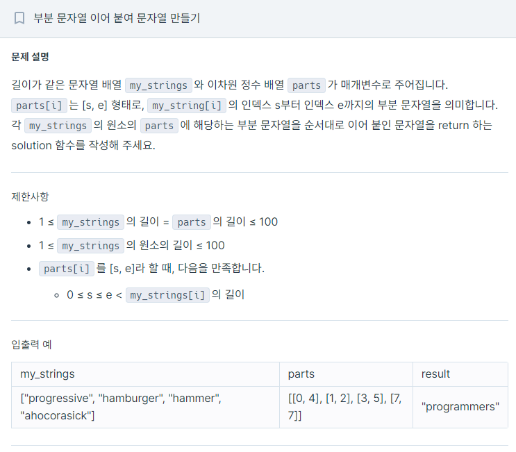 answer에 mystrings[i]번쨰 ㅁ누자열에서 parts[i][0]번째부터 parts[i][1]까지 문자열을 더해준다.
