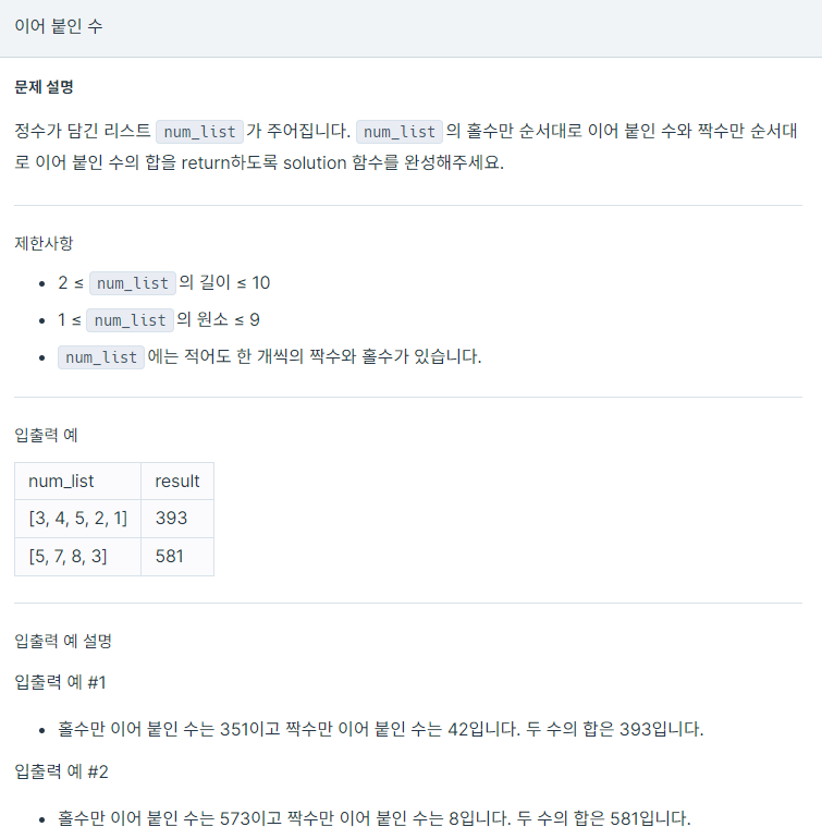 긜고 num_list크기 만큼 반복문을 만들어주고 num_list[i]가 짝수일때와 홀수 일때를 나누어서 문자열에 더해준다.